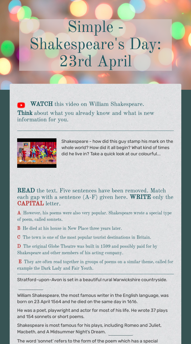 No writer's living reputation can compare to that of shakespeare, whose notable plays include the tragedies romeo and juliet, hamlet, king lear, macbeth, and othello. William carlos williams, the red wheelbarrow. In addition to his plays, shakespeare wrote many short poems and a few longer poems.